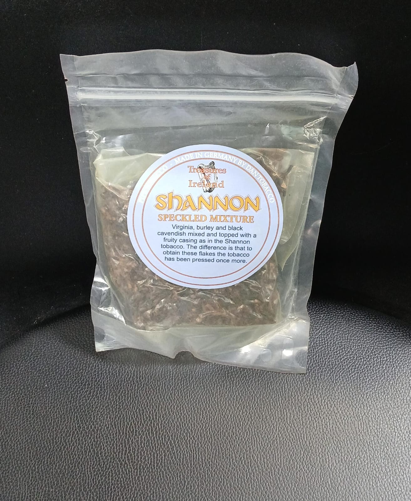 Shannon Speckled Mixture is an exquisite pipe tobacco blend that celebrates Irish tobacco tradition with a German craftsmanship touch. This distinctive blend combines premium Virginia, Burley, and Black Cavendish tobaccos, expertly mixed and topped with a delightful fruity casing reminiscent of the classic Shannon tobacco.